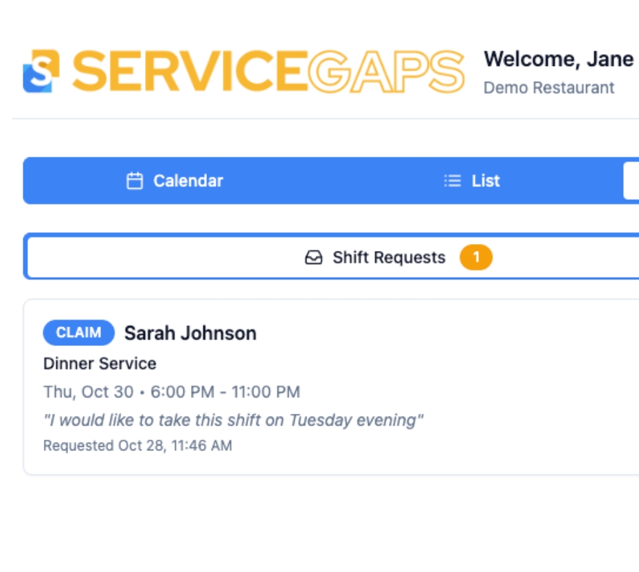 ServiceGaps is a workforce scheduling platform designed for businesses that rely on flexible, temporary staffing, like hotels, restaurants, and event companies. It helps employers manage shifts efficiently and gives employees control over their schedules with shift claiming, swapping, and real-time availability.